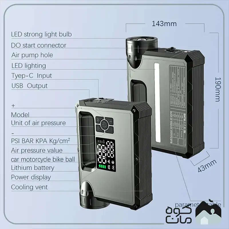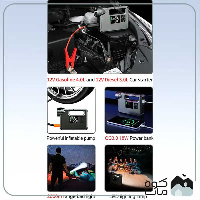 جامپ استارتر، پمپ باد،چراغ قوه، چراغ شب، پاوربانک |