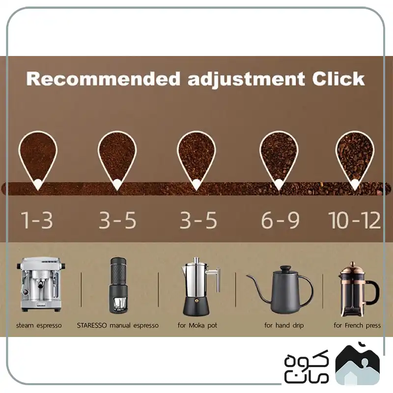 یکی از ویژگیهای برجسته این مدل، مقیاس قابل تنظیم آسیاب از 0 تا 12 است که به شما اجازه میدهد دانههای قهوه را از حالت بسیار ریز تا درشت آسیاب کنید. این قابلیت باعث می شود آسیاب Staresso D6 برای تمام روش های دم آوری قهوه کاربرد داشته باشد: