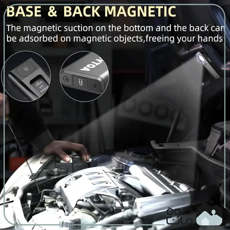 - قابلیت نصب مغناطیسی: این مدل دارای مگنت های قوی است که کار با چراغ را بسیار راحت تر می کند. شما می توانید هنگام تعمیر خودرو، در حال کمپینگ یا زمانی که دست هایتان مشغول است، چراغ را روی هر سطح فلزی ثابت کنید و محیط کاملاً روشن داشته باشید.