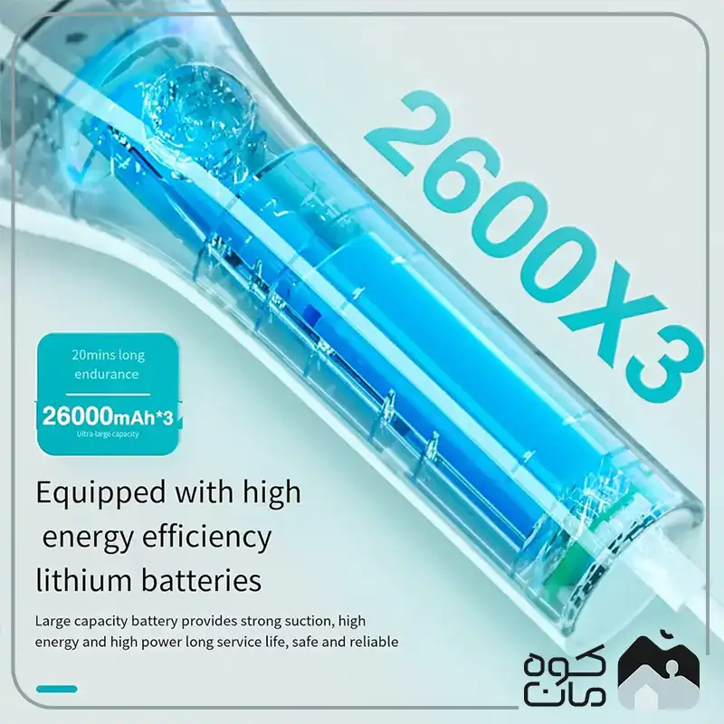 باتری 3 سلولی 2600mAh لیتیومی با ولتاژ 11.1 ولت یکی دیگر از ویژگی های مهم این جارو است. با استفاده از چیپ هوشمند AI، مصرف انرژی مدیریت شده و طول عمر باتری تا 600٪ افزایش می یابد. مدت زمان شارژ کامل دستگاه بین 3 تا 4 ساعت است و پس از آن می توانید از کارکرد طولانی و بهینه دستگاه بهرهمند شوید. همچنین، شارژ Type-C سرعت و سهولت بیشتری در استفاده روزانه فراهم می کند.